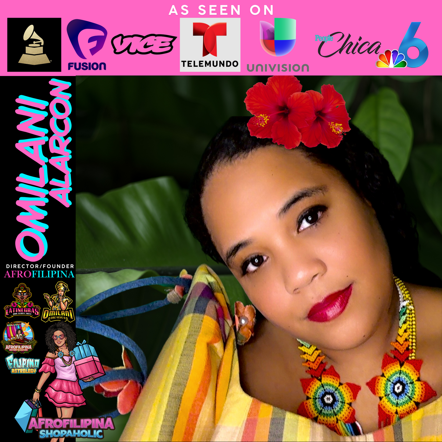 OMILANI is a graduate of Cornell University in Ithaca, NY. She is an AfroFilipina powerhouse blending art, scholarship, and advocacy who has definitely proven she can hold center stage. As the founder of the Latinegras and AfroFilipina brands, she continues to break boundaries as a performing artist, runway model, advocate, philanthropist, and scholar. As a top 7 GRAMMY Showcase Finalist, Ms. Alarcon combines her love for community, music and fashion into her comic book project AfroFilipina Shopaholic which has the distinction of being the first AfroFilipina comic book superhero and protagonist. Omilani continues to leave her mark on the world through scholarly publications, albums, and unforgettable performances.